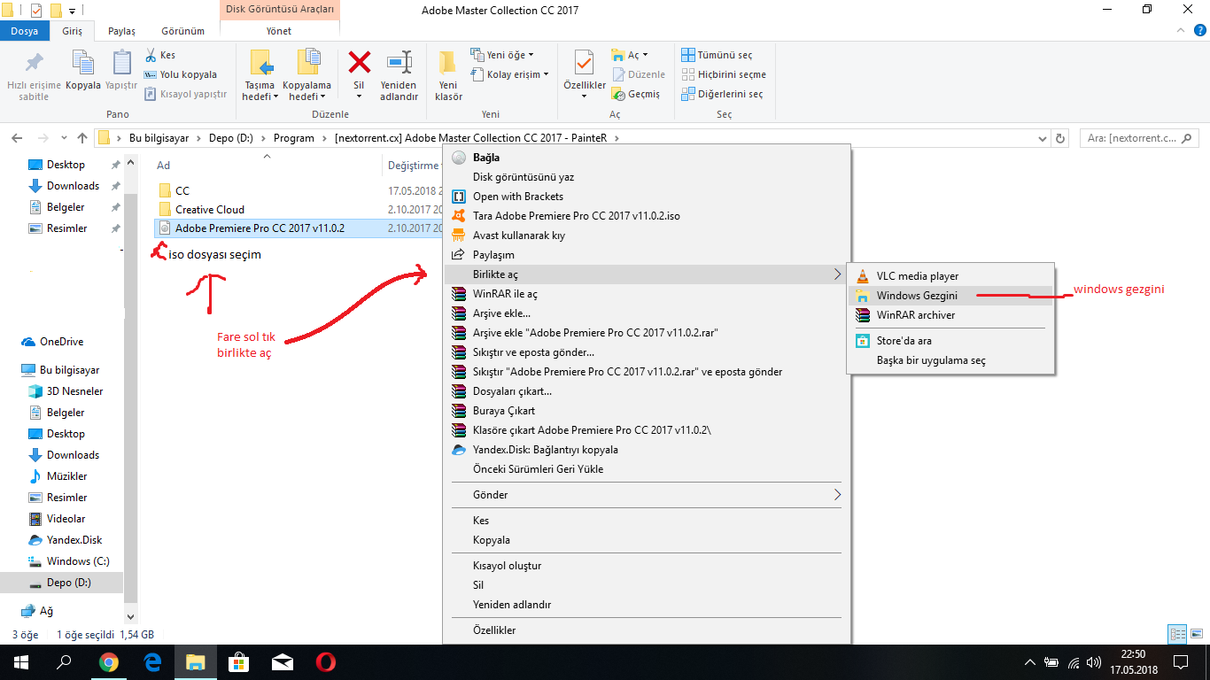 indirdiğiniz iso dosyasına seçip fareyle sol tıka basıyoruz ve ardından birlikte aç diyerek windows gezgini seçiyoruz. Ardından adım 2 geçiyoruz